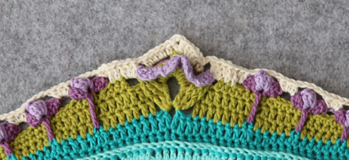 Rep from * to * 7 more times, omitting the last Corner Flower on the last repeat. Join to the first sc with a sl st. Fasten off and work away your ends.
