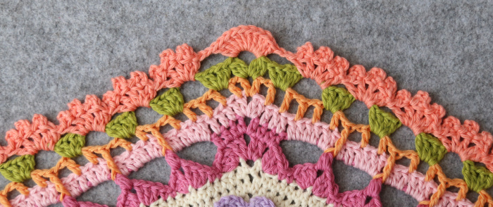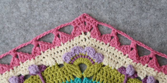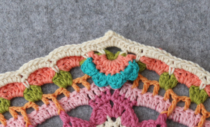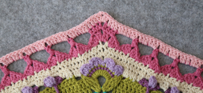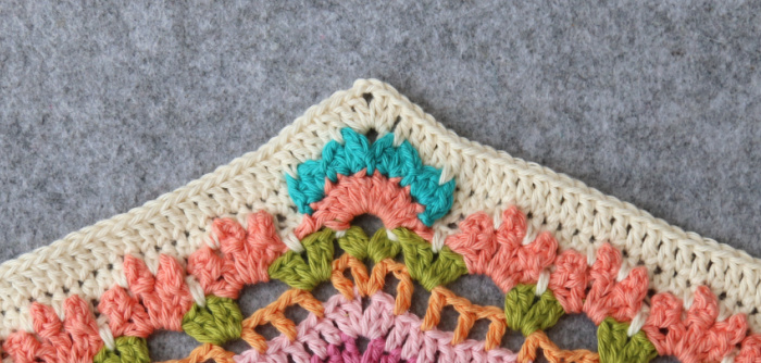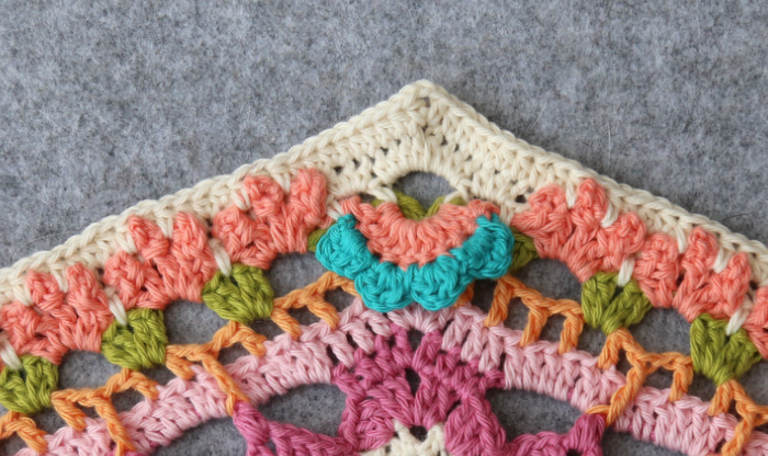 Rep from * to * 7 more times, omitting the last corner on the last repeat. Join to the top of the first 3-dc Bobble with a sl st. Fasten off and work away your ends.