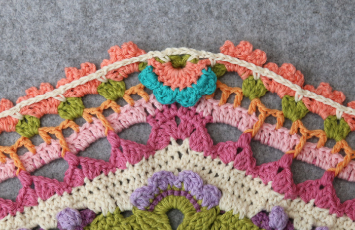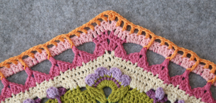 Rep from * to * 7 more times, omitting the last corner on the last repeat. Join to the third ch of the beg ch-5 with a sl st. Fasten off and work away your ends.