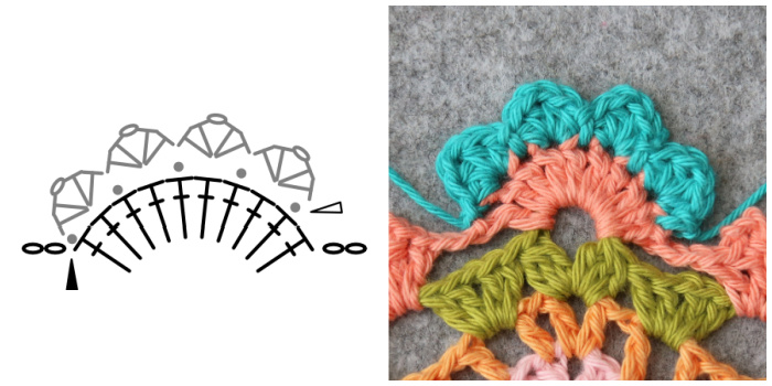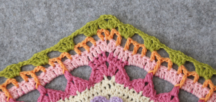 Tester’s Tip: When making these 94 sts, you may find it easier to work in sets of 6 sts (the 4th and 6th of which will fall in a ‘catching dc) until 9 sts remain (15 repeats). Dc in the next 4 sts. This equals 94 sts – Susanne van der Wal