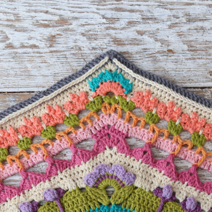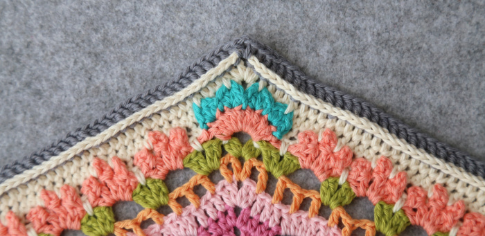 Rep from * to * 7 more times, omitting the last corner on the last repeat. Join to the first hdc with a sl st. Fasten off and work away your ends – this is not necessary if you are going to use the same colour for the next round (Seaside Colourway, I’m looking at you…)