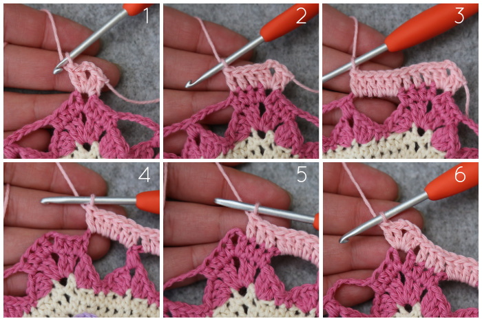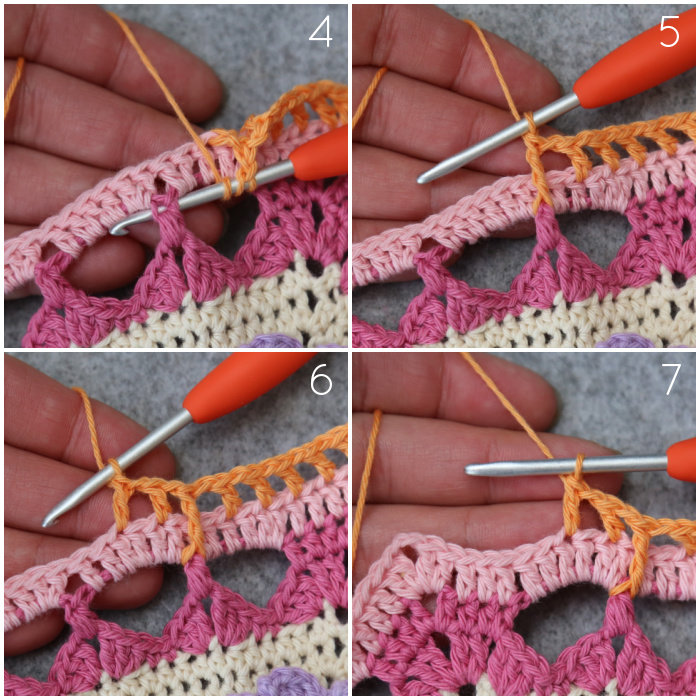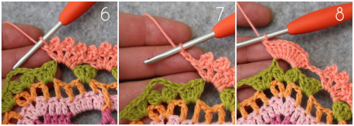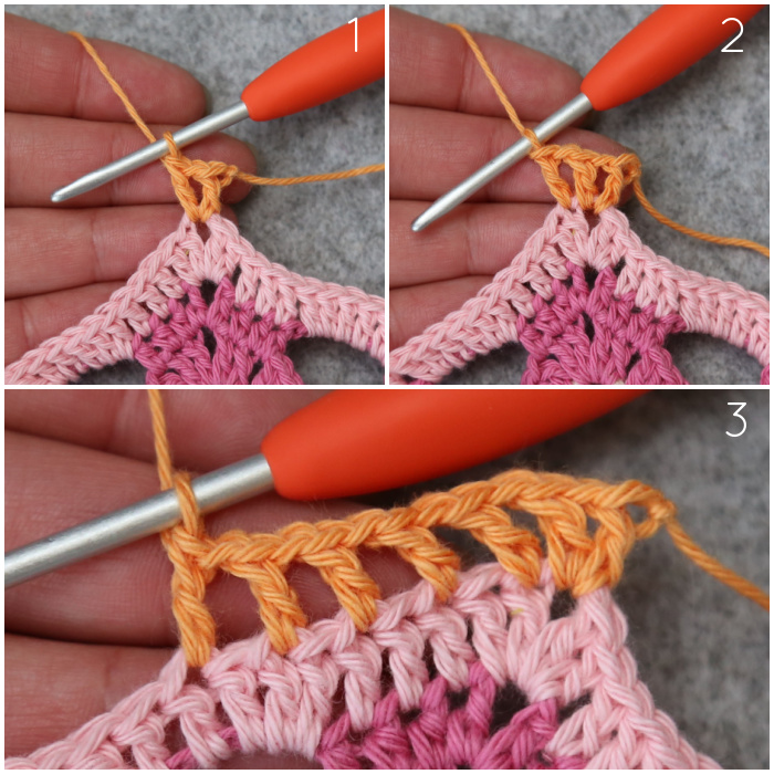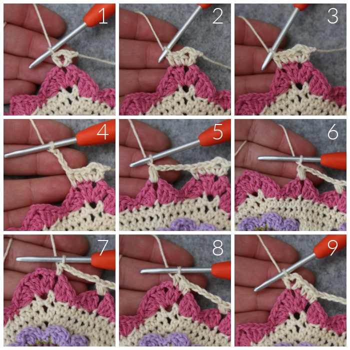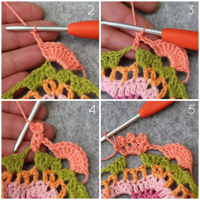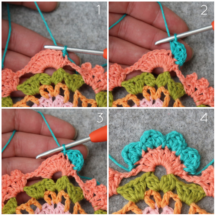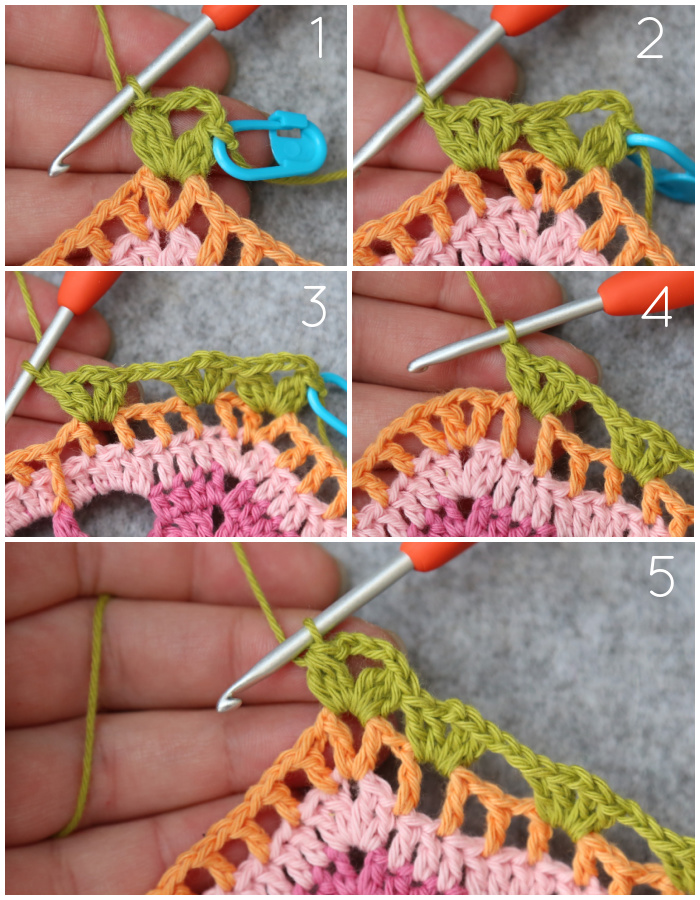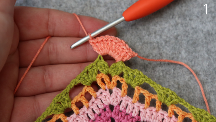 Join your yarn by making a sl st in the second dc of any 10-dc corner {Photo 1}. ([2 hdc, ch 1, 2 hdc] in the next st {Photo 2}, sl st in the next st {Photo 3}) 4 times {Photo 4}. Fasten off and work away your ends.