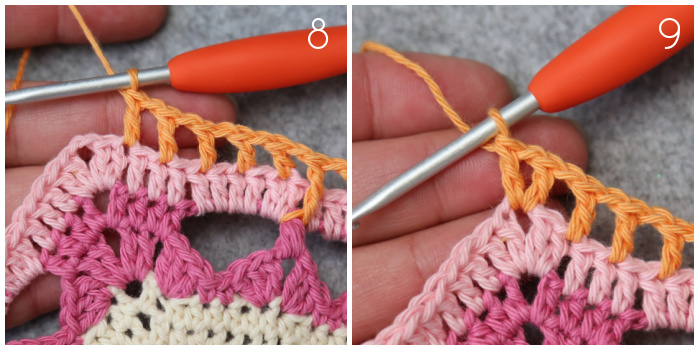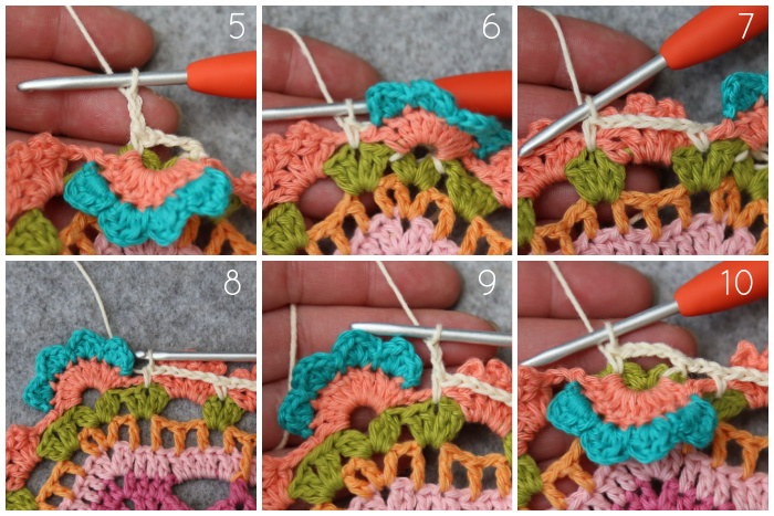 *Ch 2 {Photo 5}, make a sc in the next ch-1 sp of Round 52, working OVER the ch-2 sp from Round 53 {Photo 6}. (Ch 5, make a sc in the next ch-1 sp of Round 52, working OVER Round 53) 15 times {Photos 7 and 8}. Ch 2 {Photo 9}, BPsc around the next 3-dc Bobble from Round 52, ch 4, BPsc around the next 3-dc Bobble from Round 52 {Photo 10}.*