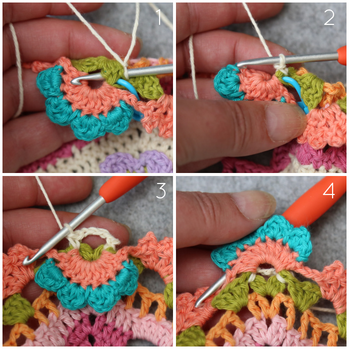 Join your yarn by making a standing BPsc around the marked 3-dc Bobble from Round 52 {Photos 1 and 2}. Remove the SM. Ch 4, BPsc around the next 3-dc Bobble {Photos 3 and 4}. This is your first corner made.