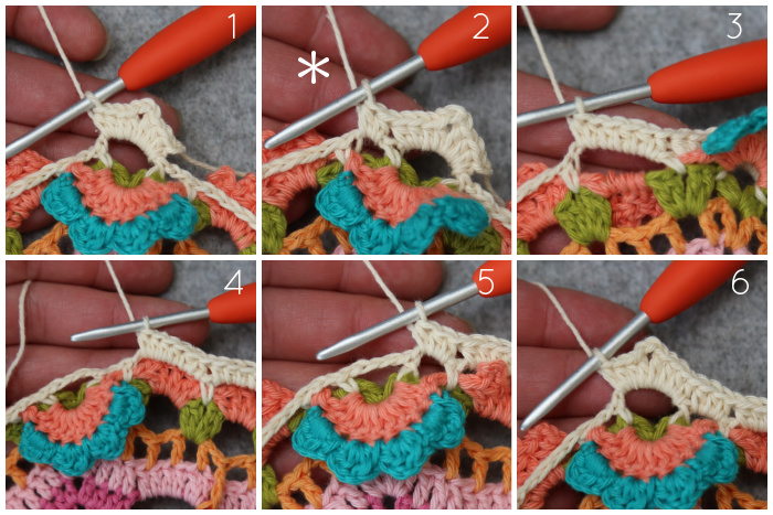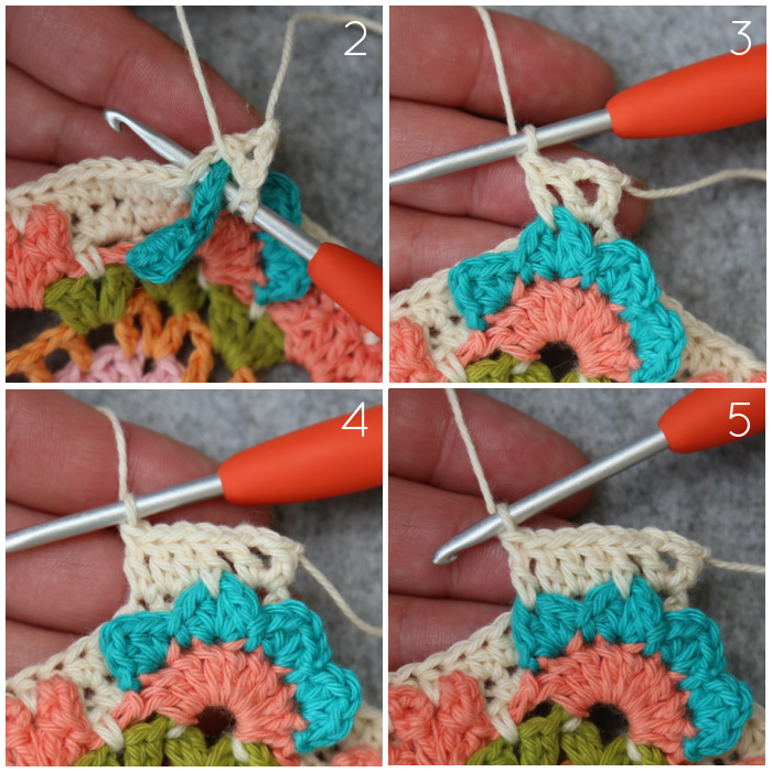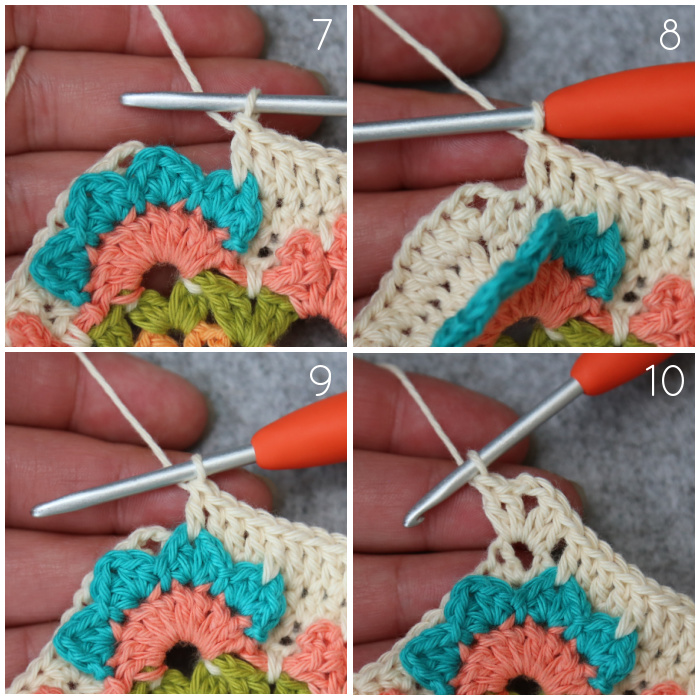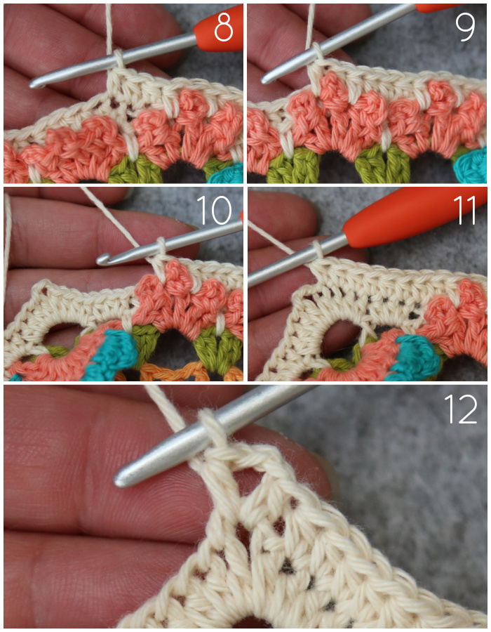 Dc in the ch-1 sp of the first Petal of the Corner Flower AND the next st {Photo 7}. Dc in the next 3 sts {Photo 8}. Dc in the ch-1 sp of the second Petal of the Corner Flower AND the next (last) st {Photo 9}. [Dc, ch 2, dc] in the next ch-2 corner sp {Photo 10}.*