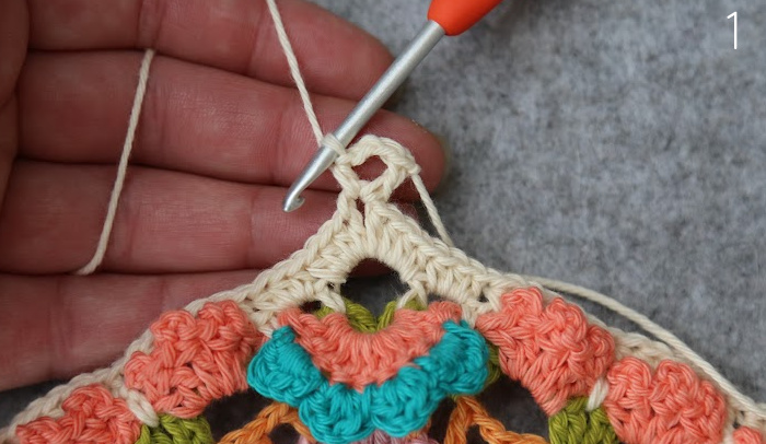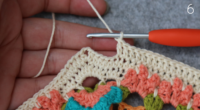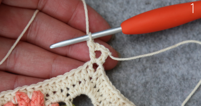 Sl st in the next ch-2 sp. Ch 5, dc in the same ch-2 sp. This is your first corner made {Photo 1}.