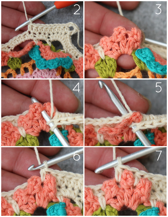 *Skip the first st, which will be tricky to get into anyway. Catch the third Petal of the Corner Flower by making a dc in the ch-1 sp of the third Petal AND the next st of Round 56 together (here and throughout) – Photos 2 and 3. Dc in the next 3 sts {Photo 4}. Catch the fourth Petal of the Corner Flower by making a dc in the ch-1 sp of the fourth Petal AND the next st of Round 56 {Photo 5}.