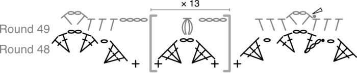 (Ch 1, skip the last 2 dc of the 6-dc group, make a FPtr around the Puff st from Round 49 {Photos 4 and 5}. Ch 1, skip the first dc of the next 6-dc group, dc in the next dc. Ch 1, skip the next dc, dc in the next dc {Photo 6}) 13 times {Photo 7}. There should now be 7 sts left.
