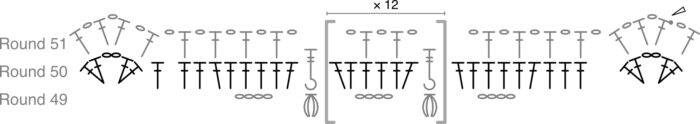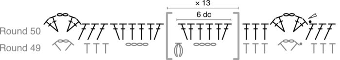 (Ch 1, skip the last 2 dc of the 6-dc group, make a FPtr around the Puff st from Round 49 {Photos 4 and 5}. Ch 1, skip the first dc of the next 6-dc group, dc in the next dc. Ch 1, skip the next dc, dc in the next dc {Photo 6}) 13 times {Photo 7}. There should now be 7 sts left.