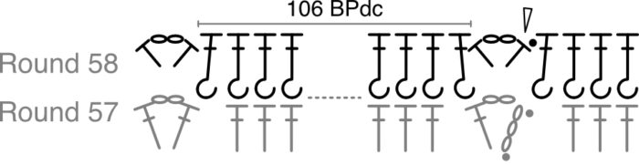 *BPdc in the next 106 sts. [Hdc, ch 2, hdc] in the next ch-2 corner sp.*