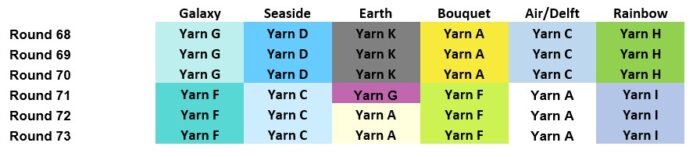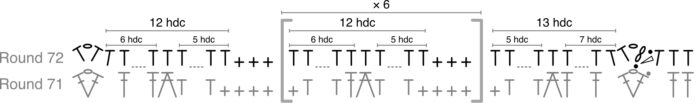 Landmark: The first leg of the dc2tog in bold will fall in the hdc made into the weird joining hdc from Round 69.