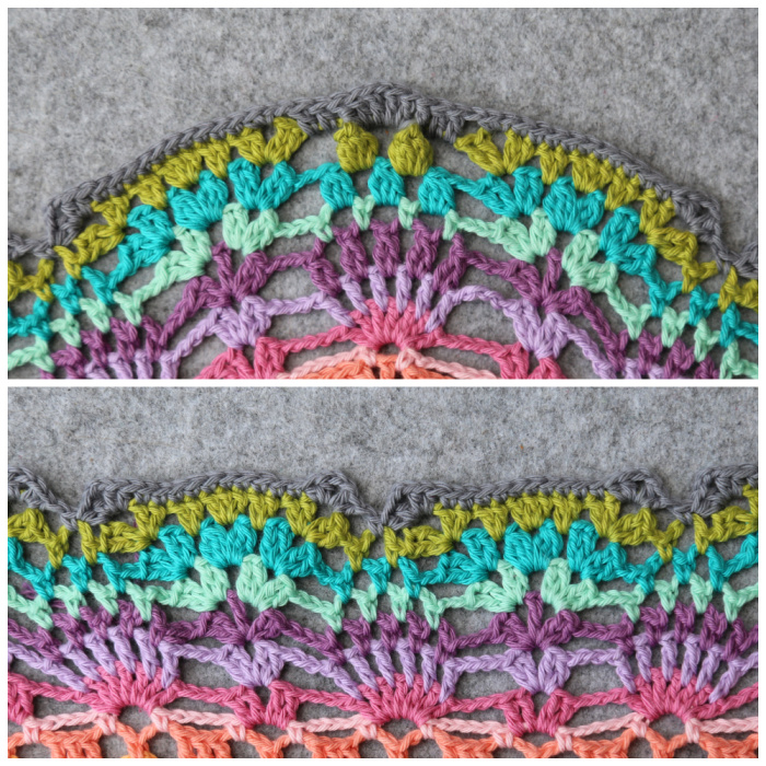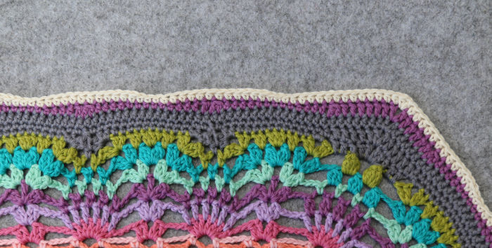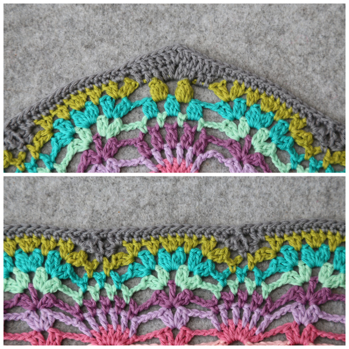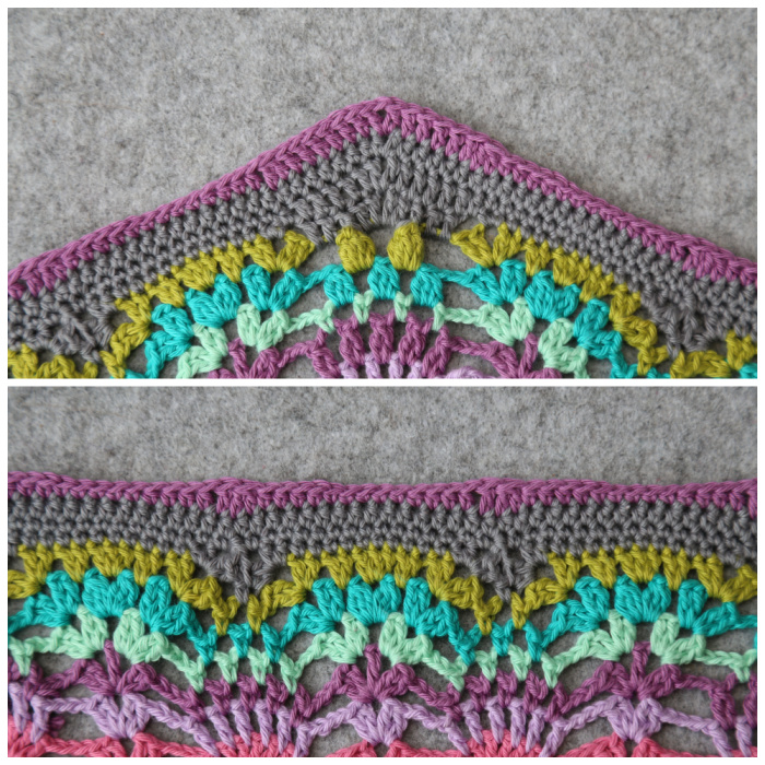 Tester’s Tip: “If you want landmarks when making the 123 hdc, here are the stitches that will land in the ‘weird joining hdcs’: 22, 38, 54, 70, 86, 102. So the 22nd hdc of the side (not including the corner hdc), then every 16th hdc until there are 21 sts left before the corner sp.” – Kay Crone and Susanne van der Wal