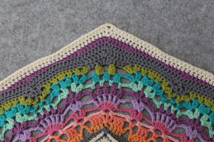 Rep from * to * 7 more times, omitting the last corner on the last repeat. Join to the third ch of the beg ch-5 with a sl st. Fasten off and work away your ends.
