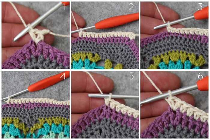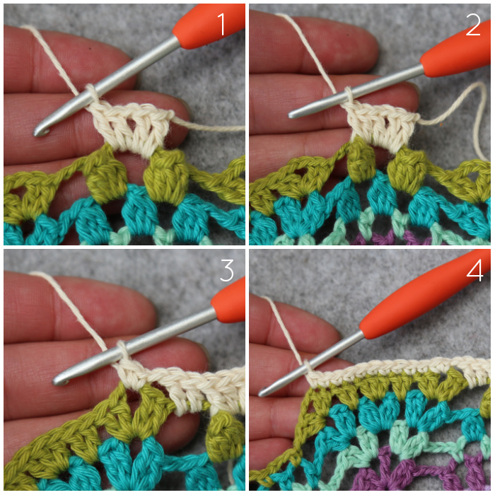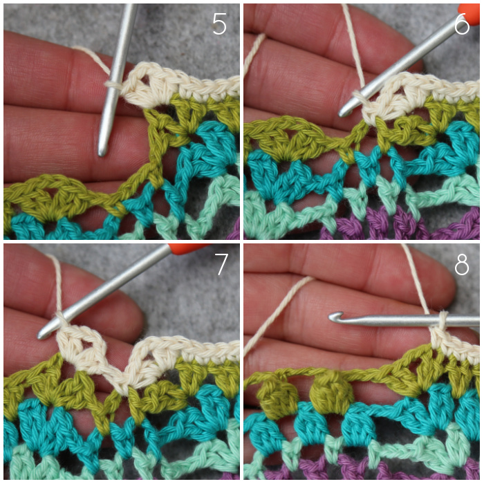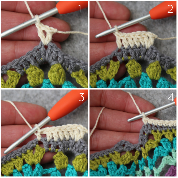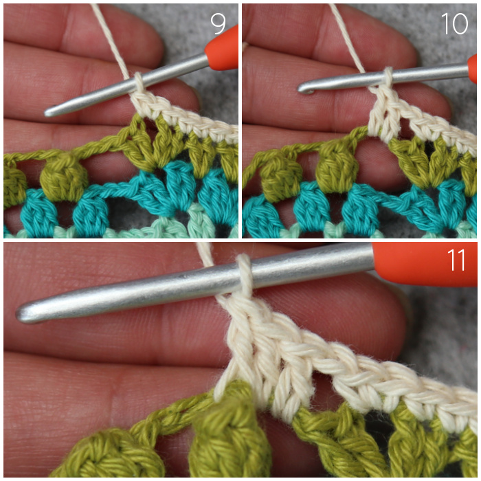 *Dc in the next 5 sts {Photo 2}, hdc in the next ch-1 sp {Photo 3}. Skip the next st, sc in the next 13 sts {Photo 4}.