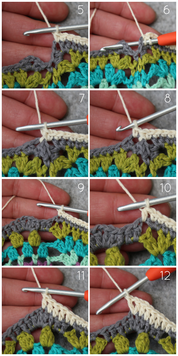 (Sc in the next 3 sts {Photo 3}, hdc in the next 12 sts, the sixth of which will fall in a dc2tog {Photo 4}) 7 times {Photo 1}. [Hdc, ch 1, hdc] in the next ch-1 corner sp {Photo 6}.*