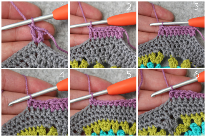 - If you are using a new colour: Join your yarn by making a standing hdc in the ch-1 sp of any corner. Ch 1, hdc in the same ch-1 corner sp. This is your first corner made {Photo 1}.