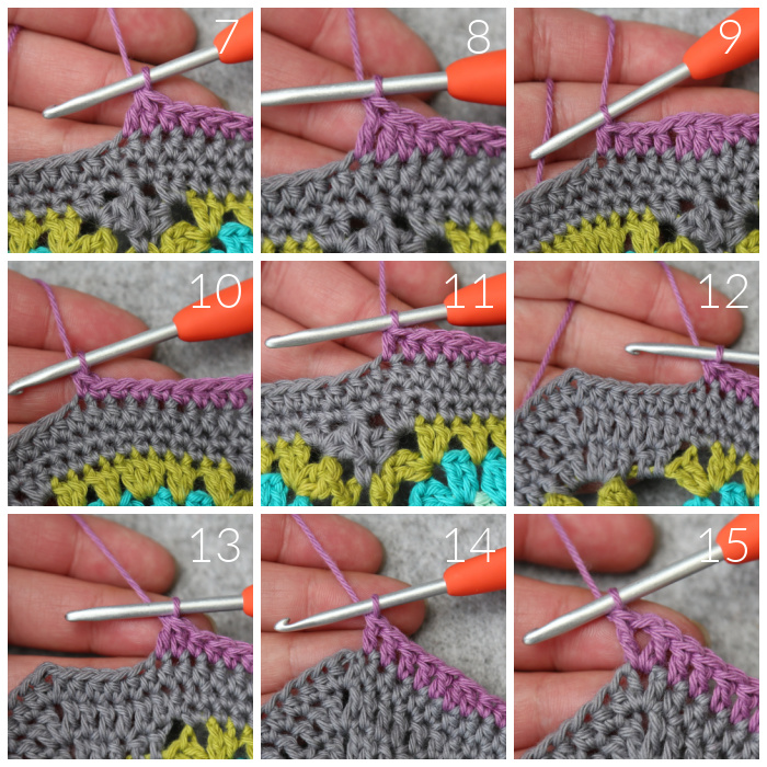 (Dc2tog {Photo 7}. Dc in the next st, hdc in the next 4 sts {Photos 8 and 9}, sc in the next 5 sts {Photo 10}, hdc in the next 4 sts {Photo 11}) 6 times. There should now be 7 sts left {Photo 12}. Dc2tog {Photo 13}, dc in the last 5 sts {Photo 14}. [Dc, ch 1, dc] in the next ch-1 corner sp {Photo 15}.*