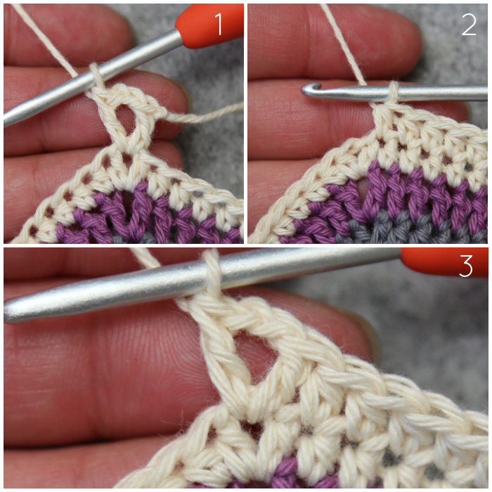 Sl st in the next ch-1 sp. Ch 5 (counts as dc and ch-2). Dc in the same ch-1 sp. This is your first corner made {Photo 1}.