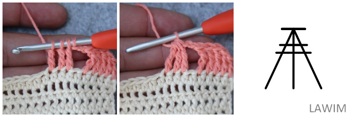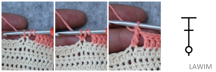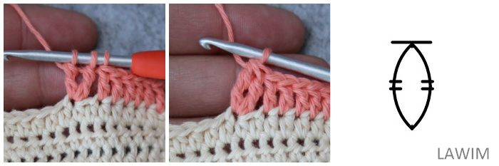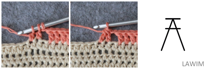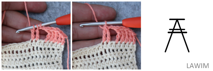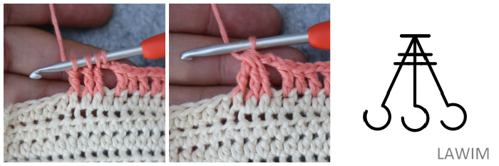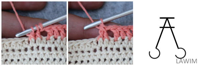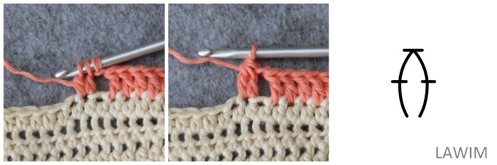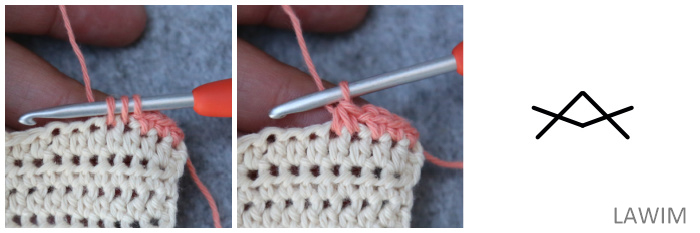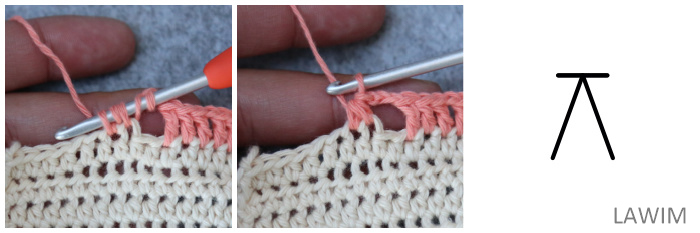 Yarn over, insert your hook into the indicated st, yarn over and pull up a loop. Yarn over and pull through ONE loop. (Yarn over and pull through two loops) twice.