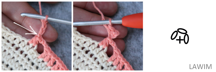 Insert your hook into the indicated st/sp. Yarn over and pull up a loop. Insert your hook into the next st/sp. Yarn over and pull up a loop. Yarn over and pull through all 3 loops.