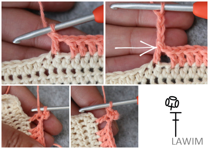 - Identify the post of the stitch you want to work around. Insert your hook from the back to the front and then from the front to the back around the post of the stitch so that the post lies behind your hook.