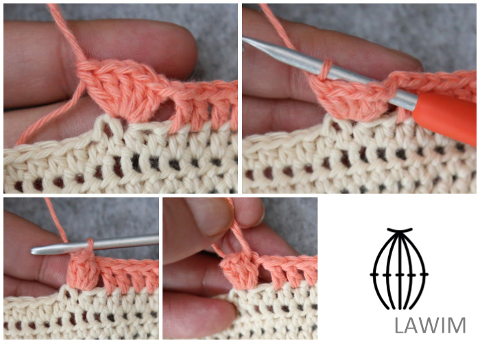 Make a dc. Ch 3, complete the Picot by making a sc in the top of the dc just made. To do this, insert your hook into both loops of the dc from the side and complete a sc.