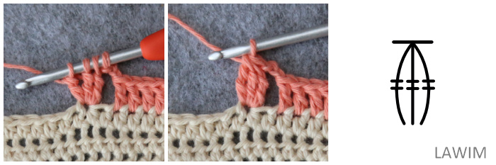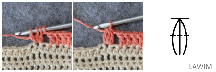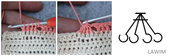 Yarn over and insert your hook into the indicated st/sp. Yarn over and pull up a loop. Yarn over and insert your hook into the next indicated st/sp. Yarn over and pull up a loop. Yarn over and pull through all 5 loops.